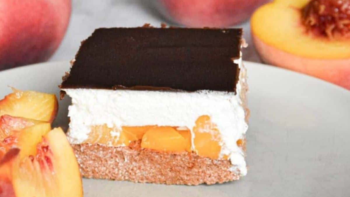 This layered cake pairs cocoa sponge with whipped cream and juicy peaches. After soaking the cake in sweet rum milk, each layer turns soft and flavorful. The glossy chocolate topping finishes the dessert with a smooth texture. It stands out among chocolate dessert recipes because of its balanced fruit and chocolate combination.