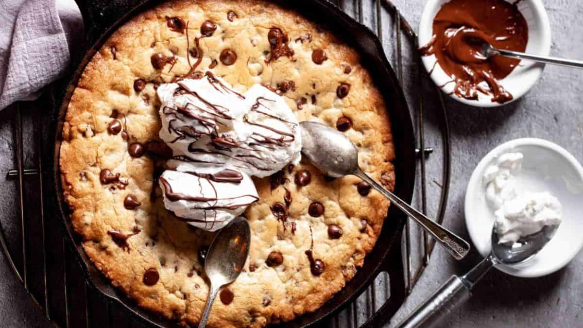 Baked in a cast-iron pan, this large cookie develops crisp edges and a soft center. Because the skillet holds heat evenly, the texture stays consistent throughout. It slices easily for sharing straight from the pan. Add a scoop of ice cream on top if you want to dress it up.