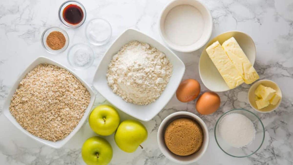 For the Caramelized Apples, you’ll need 2 1/4 cups of green apples, peeled and diced into small cubes. Cook the apples with 4 tablespoons of butter and 1/4 cup of sugar until they’re golden and caramelized. For the Dough, cream together 1 cup of butter (2 sticks) with 1 cup of packed brown sugar and 1/4 cup of sugar until smooth. Then, mix in 2 eggs and 1 teaspoon of vanilla extract for richness and flavor. Add 3 cups of rolled oats, 1 1/2 cups of all-purpose flour, 1 teaspoon of ground cinnamon, 1 teaspoon of baking soda, and a pinch of salt to create the dough base. Combine everything, and you’re ready to assemble these delicious treats!