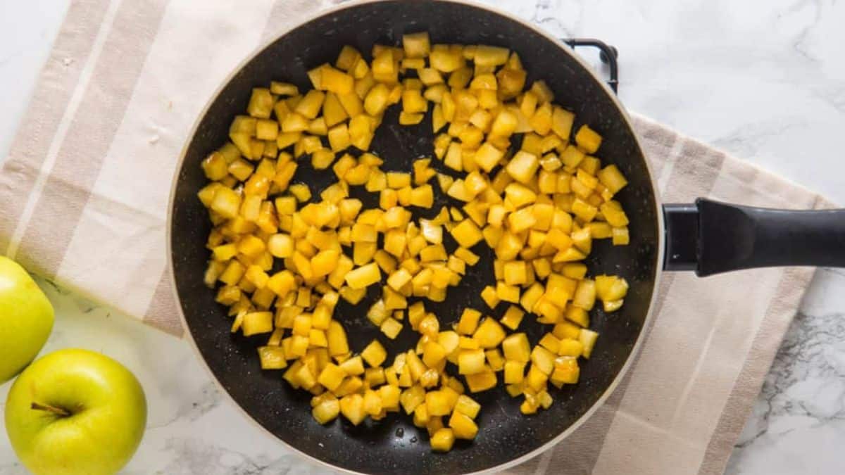In a skillet over medium-high heat, add the diced apples, 4 tablespoons of butter, and 1/4 cup of sugar. Cook, stirring occasionally, until the apples become golden and caramelized, which takes about 6 to 7 minutes. Once caramelized, remove the skillet from heat and let the apples cool completely before adding them to the dough.