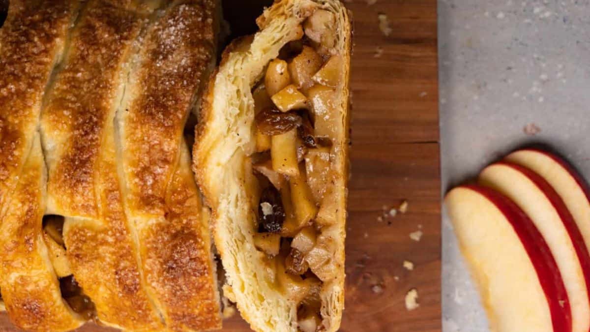 Flaky puff pastry wraps spiced apples for a faster pie option. Then, walnuts and raisins add texture in every bite. It’s great for busy days when time feels tight.