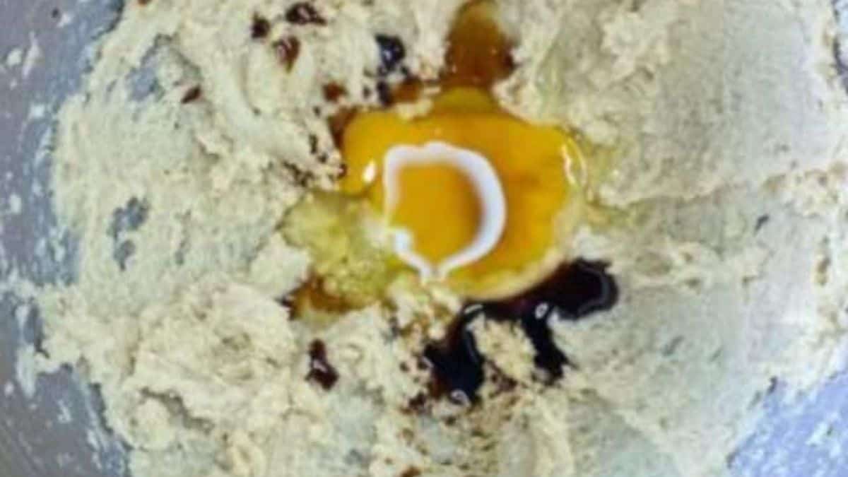 Beat in the egg and vanilla extract, mixing thoroughly until everything is fully combined, ensuring a smooth and flavorful cookie dough.
