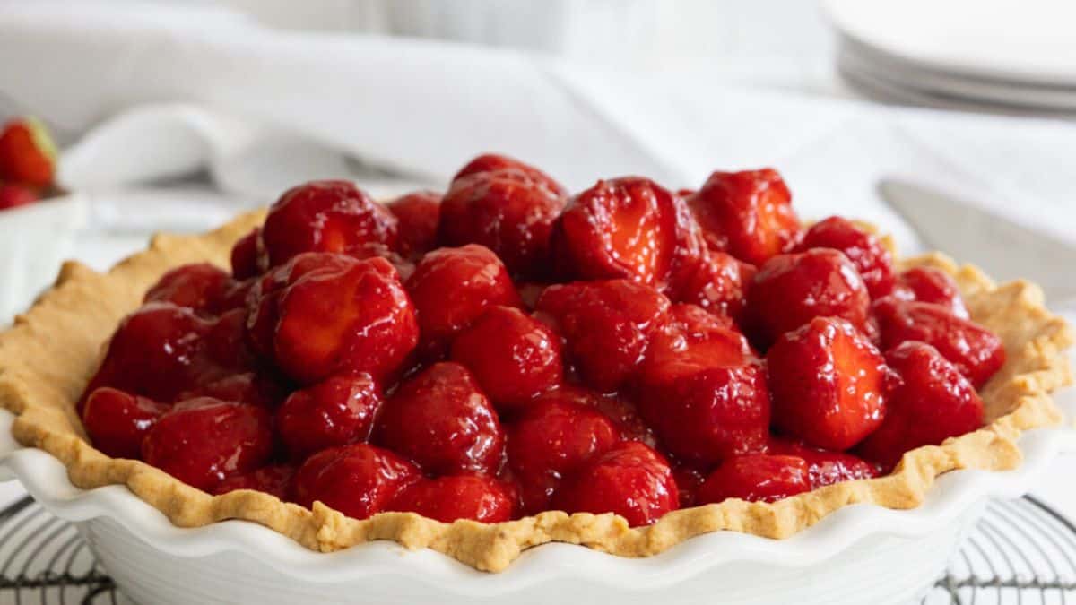 This pie highlights fresh strawberries with a firm filling. The crust holds together cleanly when sliced. It works well for seasonal menus.