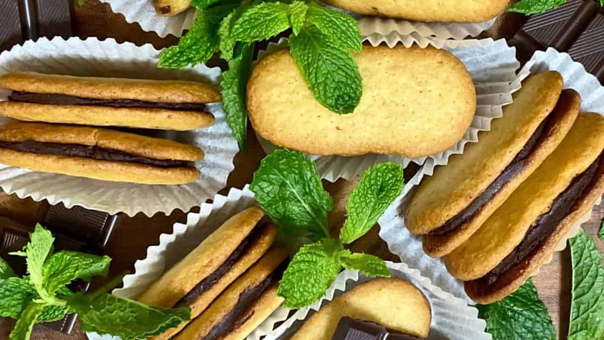 These sandwich cookies pair crisp vanilla biscuits with a thin mint chocolate center. They set firmly once cooled, which helps with clean layers. They work well for gifting or dessert trays.