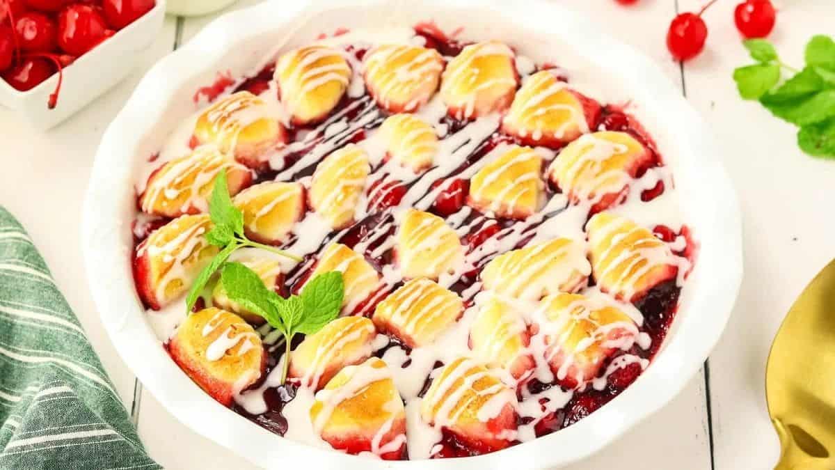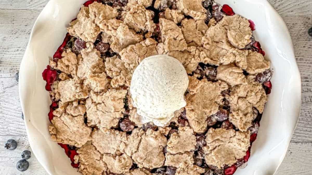 With a mix of juicy cherries and sweet blueberries, this dessert delivers balanced flavor without being too sweet. The golden topping is soft in the center with slightly crisp edges. It’s one of those cobbler recipes you’ll come back to every summer. Don’t skip the scoop of vanilla ice cream.