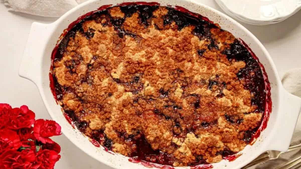 This one brings together blackberries, strawberries, and raspberries with a soft, buttery topping. It’s simple to prep and perfect for using up extra fruit during berry season. You can bake it ahead and reheat leftovers the next day. Out of all the cobbler recipes, this one is especially crowd-friendly.