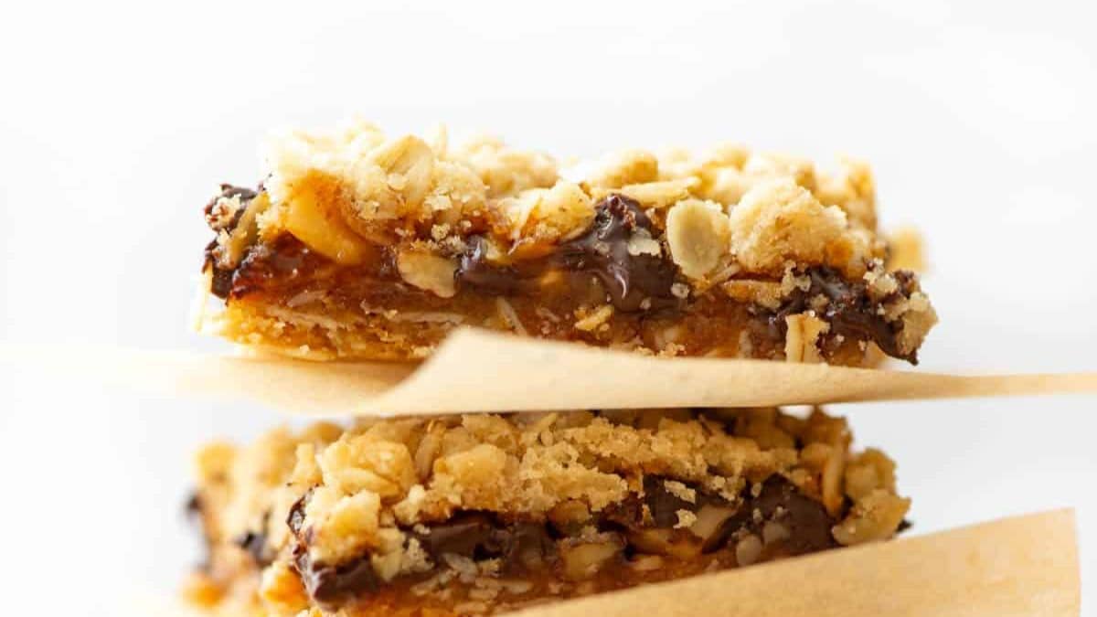 Loaded with peanut butter, oats, and chocolate candies, these bars are rich and filling. They hold their shape but stay soft in the middle. You’ll get a big batch from one pan. Bring them to parties and expect them to disappear fast.