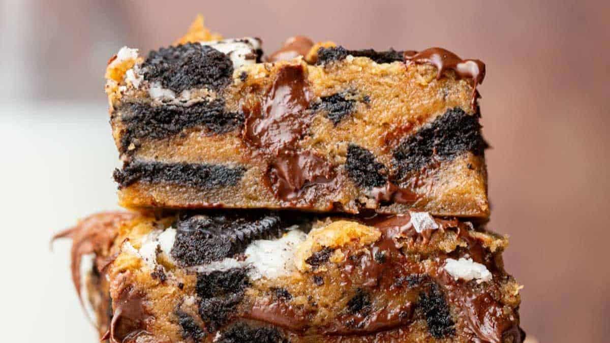 These Oreo blondies come together in one bowl, no leavening needed. The combination of dark chocolate chips, Oreo chunks, and a dash of espresso keeps things bold. The inside stays extra gooey, so they’re closer to fudge than cake. You’ll want to let them cool before slicing.