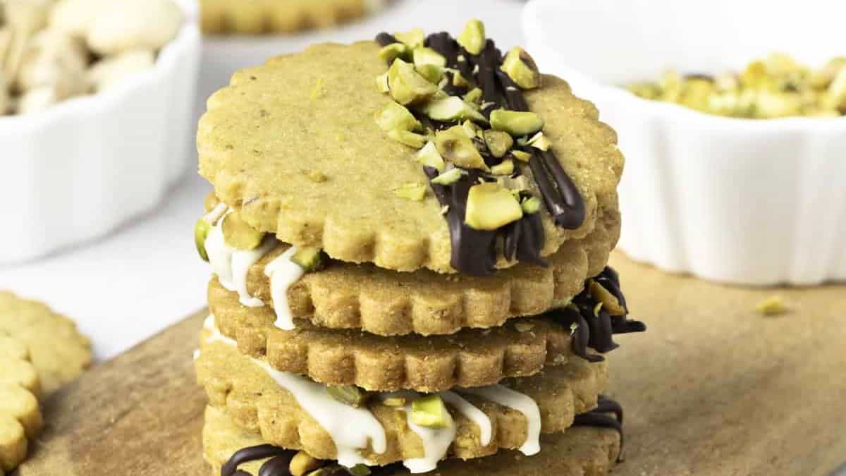 Buttery shortbread meets the rich, nutty taste of pistachios in this crisp cookie. The finely chopped nuts create a delicate crunch that pairs well with the smooth shortbread texture. They’re a great pick for those who enjoy cookies with nuts in a simple, classic way.