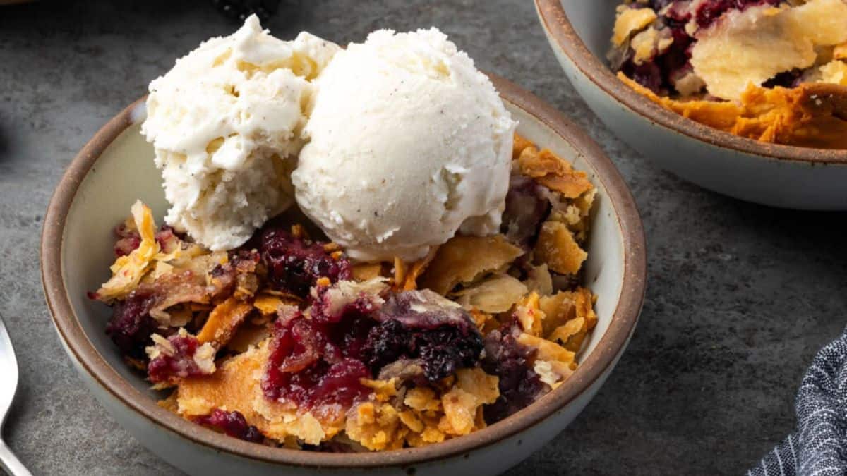 Mixed berries and a golden topping make this cobbler a simple, crowd-friendly dessert. You can use fresh or frozen fruit depending on what you have. Serve it warm with ice cream for the full effect. It’s one of the better cobbler-style options if you’re after easy berry dessert ideas.
