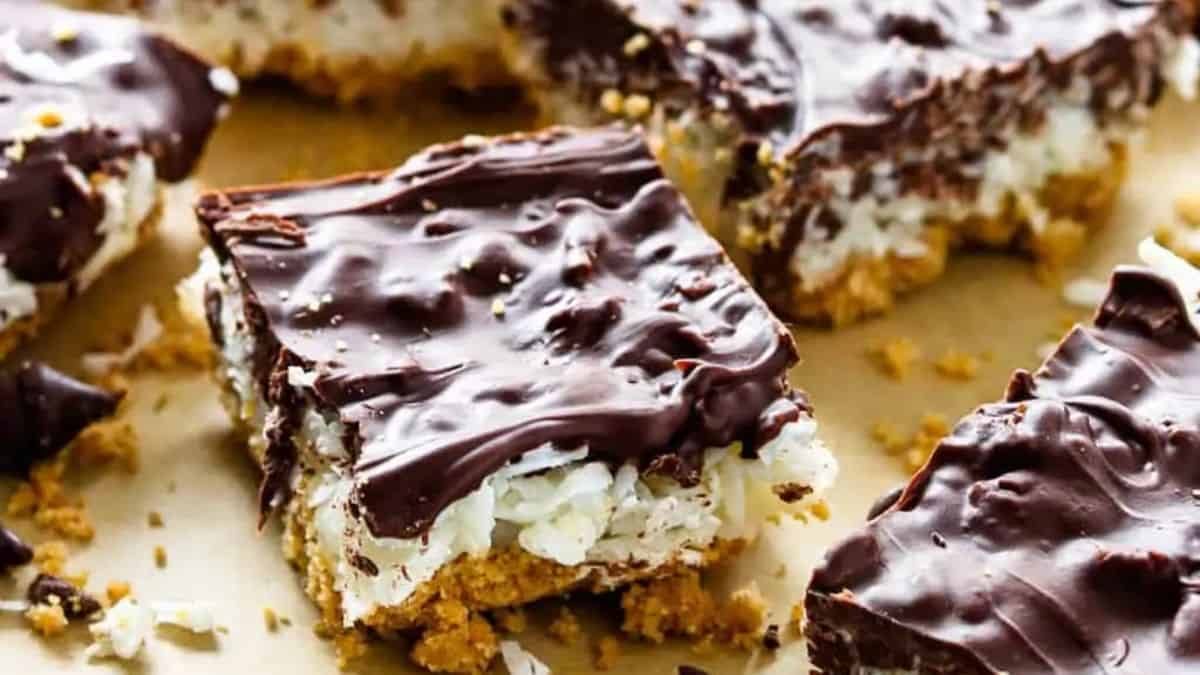 I bake the shortbread layer first, then add caramel and toasted coconut before topping it with chocolate. The bars hold together well, even though they’re loaded. They taste pretty close to the original cookies but take way less time. They work great as a bake sale or freezer-friendly dessert.
