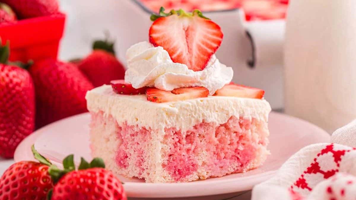 This strawberry poke cake is pure fun from start to finish. The strawberry gelatin seeps into every bite, giving the cake a bright flavor and a gorgeous color. Once you top it with cream cheese frosting and fresh strawberries, it feels like summer on a plate. Just give it time to chill before serving—it’s worth the wait.