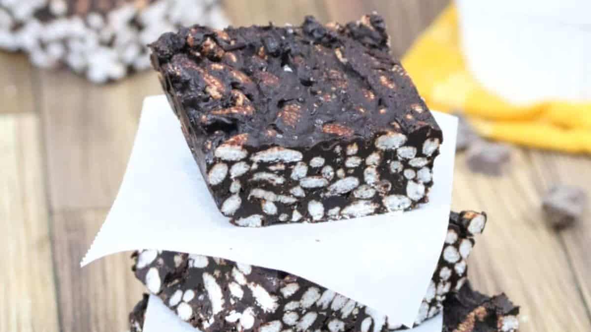 These bars mix crisp rice cereal, peanut butter, and dark chocolate for a chewy, crunchy treat. Since there’s no baking involved, they’re great for hot days or when the oven’s off-limits. Chill them in the fridge before slicing. They work well for parties or as a snack bar during the week.
