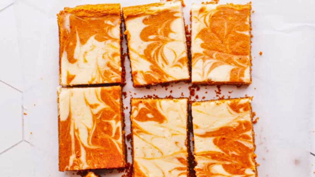 Creamy pumpkin cheesecake swirls sit on a buttery, two-ingredient crust. They bake up smooth and hold their shape perfectly. Quick to make, these bars impress with minimal effort.