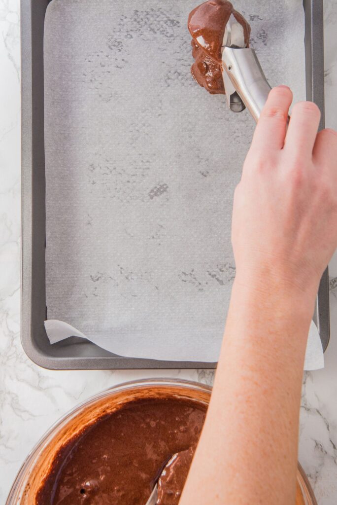 Portion the cookies: Using a #20 scoop (or approximately 2 tablespoons), portion out the batter