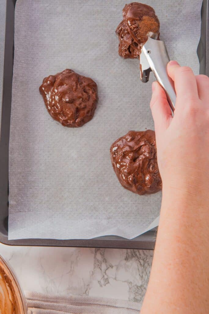 To ensure that the chocolate cake cookies cook evenly, use a cookie scoop to portion the batter.