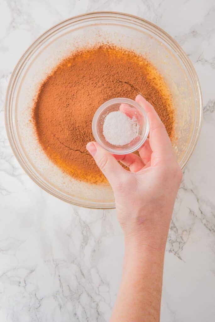 Sift in the cocoa powder and salt to avoid lumps. Stir to combine using a spatula or whisk.