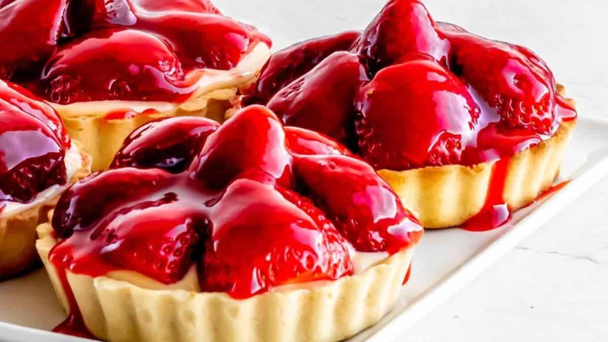 These tarts feature a crisp shortcake crust, silky custard center, and fresh strawberries on top. The glaze helps hold everything together and adds shine. They’re small, elegant, and easy to portion. Serve chilled for best flavor.