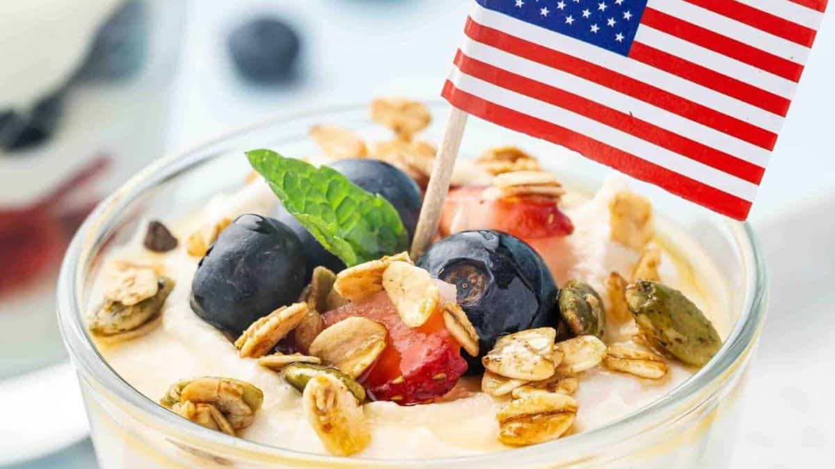This layered parfait brings together fresh strawberries, blueberries, and lightly sweetened ricotta for a creamy and refreshing finish. It’s a simple, protein-rich option you can prep ahead. Add a touch of maple syrup if you want extra sweetness. This is one of those fruit-based desserts that feels both light and satisfying.