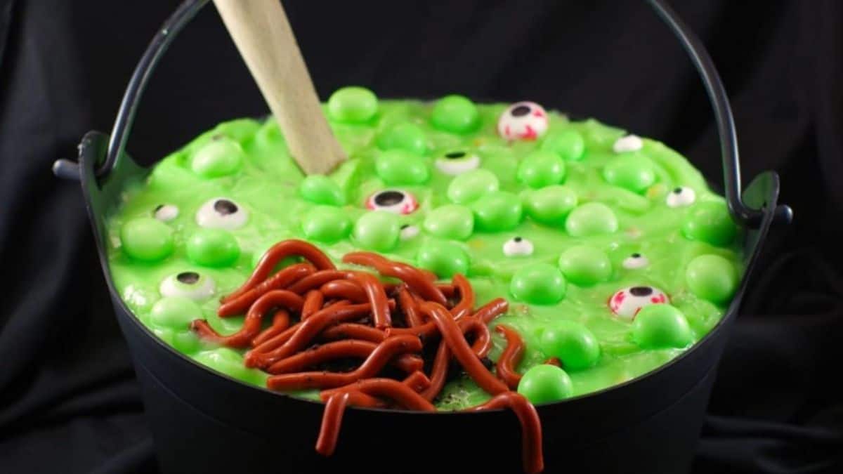 Layers of chocolate cake, pistachio pudding, and cherry cream cheese turn this trifle into a Halloween showstopper. Topped with gummy worms and candy eyeballs, it’s a mix of flavors and textures that everyone will remember. This one’s a must for any Halloween potluck table.