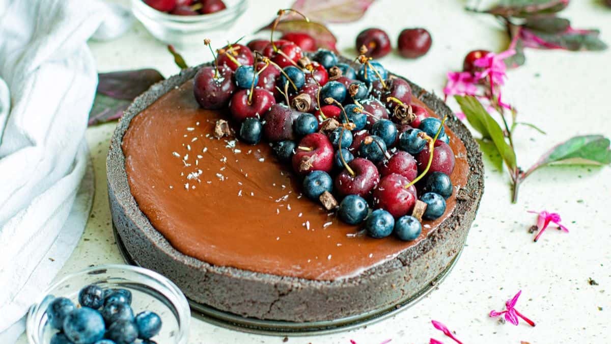 A crisp cookie crust is filled with rich chocolate ganache and finished with fresh fruit. The recipe is plant-based but doesn’t feel heavy. It’s elegant enough for dinner parties yet simple enough for everyday treats.