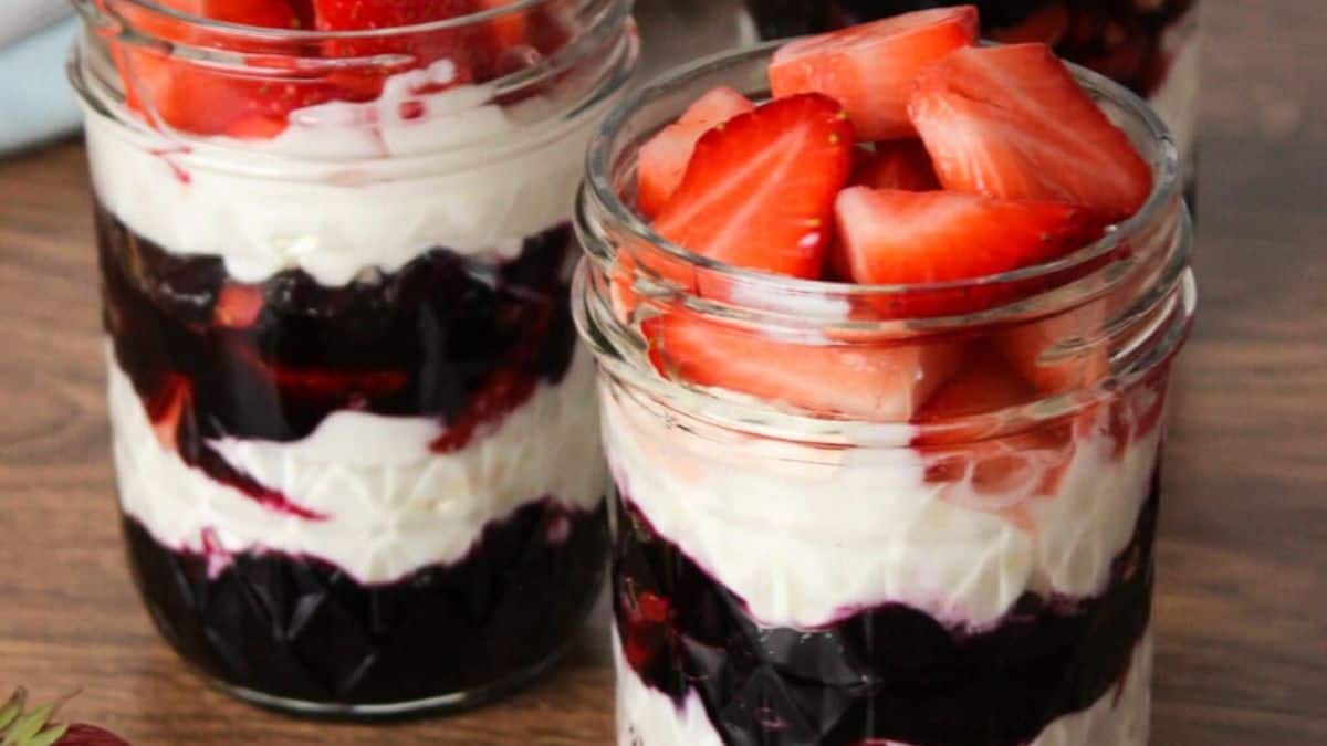 Made with only three ingredients, this strawberry mousse is light and fluffy. It skips gelatin but still holds its shape when chilled. It’s a fun no‑bake summer desserts choice for warm evenings or casual get‑togethers.