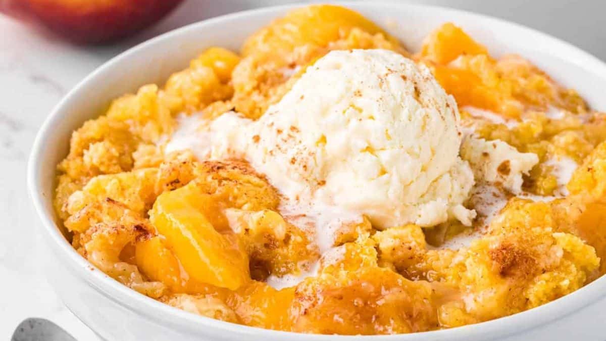 Peach Cobbler Cake turns dessert into a double feature: vanilla cake plus peach cobbler topping. That brown sugar crumble and sweet glaze don’t mess around. When ranking peach desserts, this one checks every single box.