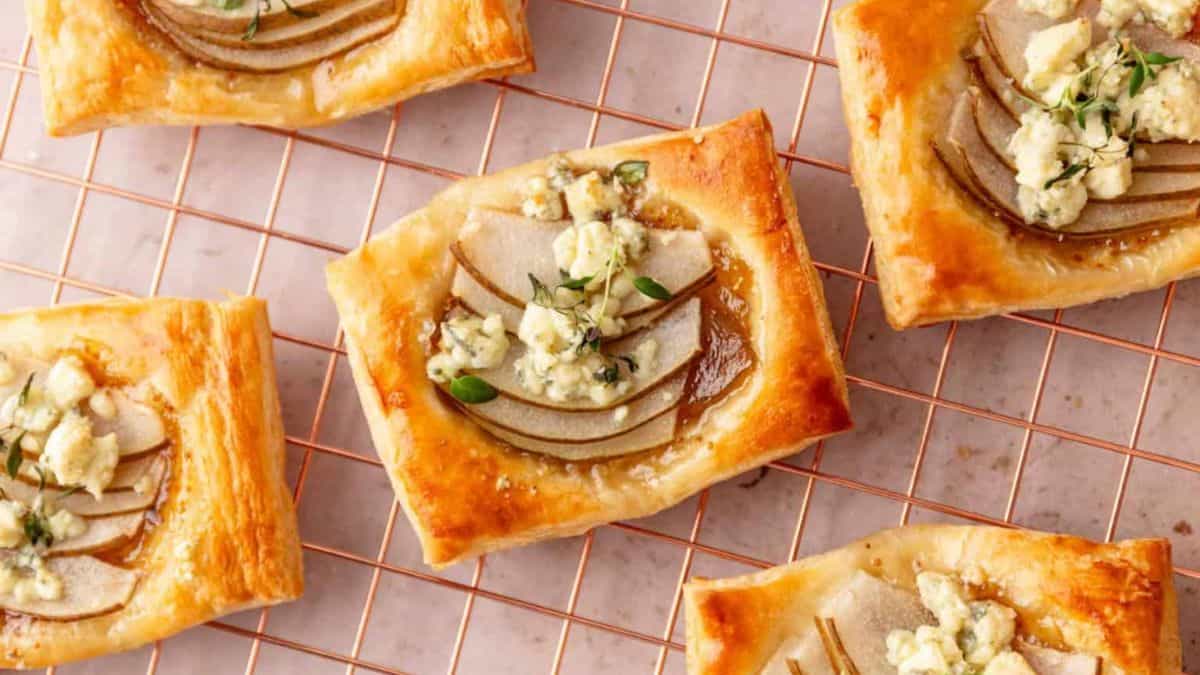 Fresh pears, blue cheese, and a touch of fig jam sit on crisp puff pastry, making each tart rich but balanced. They’re easy to prep and bake quickly. If you’re hosting brunch or need an appetizer with minimal work, these are a solid choice. Serve right from the oven for best texture.