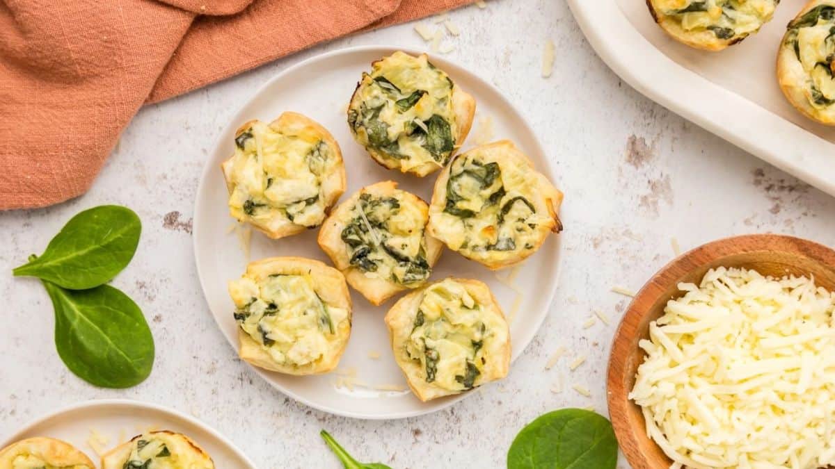 Creamy spinach artichoke dip gets a crunchy upgrade in these flaky, two-bite snacks. They’re simple to prep and perfect for feeding a crowd. Since they use puff pastry, the texture stays crisp even after cooling. These work well as party starters or weekend treats.