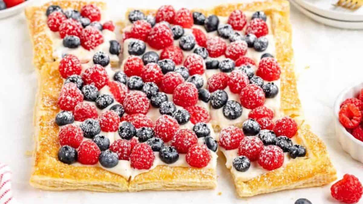 This tart uses store-bought puff pastry topped with cream cheese and a mix of fresh berries. You start by spreading the cream cheese, then arrange fruit on top. It bakes quickly and looks beautiful on any dessert table. If you’re gathering puff pastry dessert recipes, this one is a standout for summer gatherings.