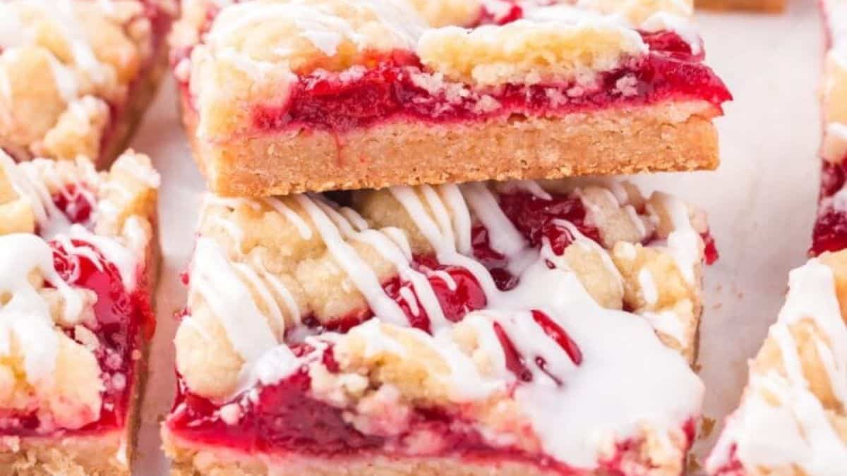 These bars skip the pie crust and go for sugar cookie dough as both the base and top layer. Cherry pie filling sits in between, and a light vanilla glaze adds a final touch. They’re easy to bake in one pan and cut cleanly for serving at events. They’re also a low-effort pick for summer cherry desserts.