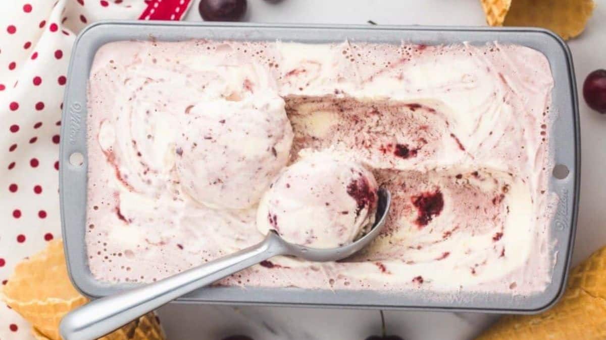 You only need four ingredients to pull off this cherry vanilla ice cream. It comes together quickly and doesn’t require any special tools. The result is creamy, cool, and loaded with bright cherry flavor. It’s one of the easiest summer cherry desserts to keep in your freezer.