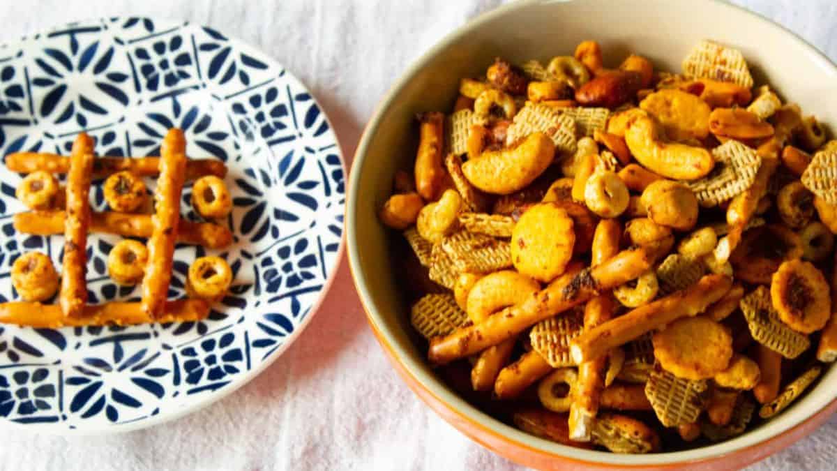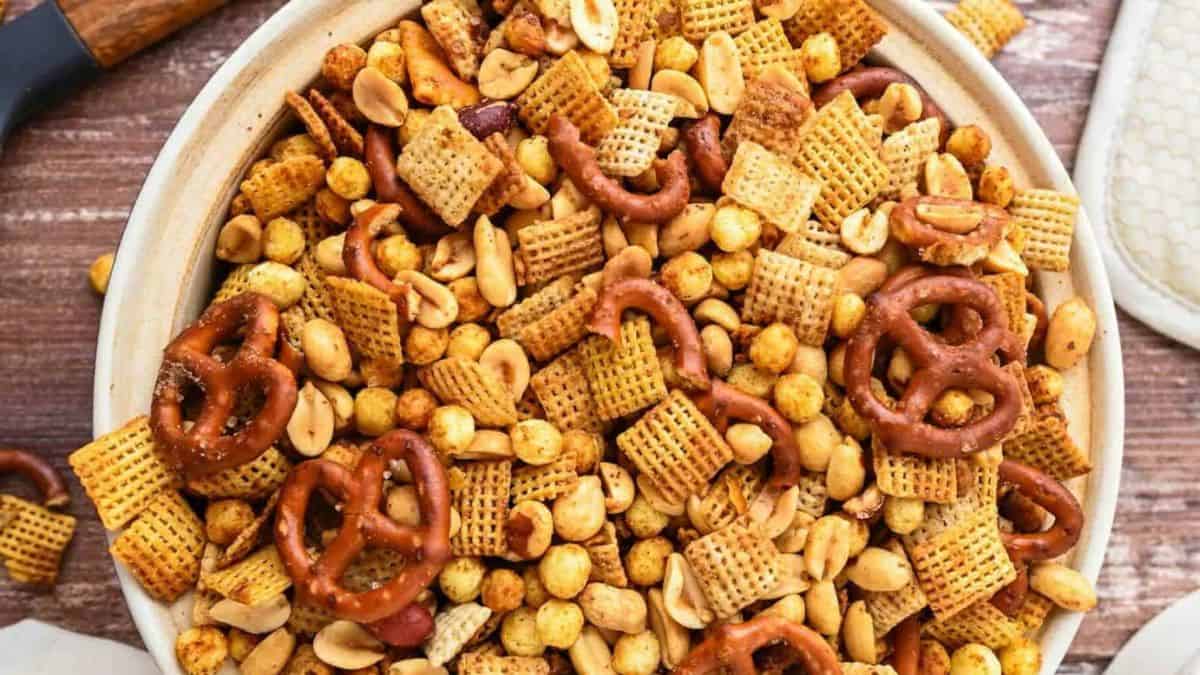 This mix relies on cereal, nuts, and a savory seasoning blend for a crisp and flavorful snack. It bakes slowly so the seasoning absorbs well. The final texture is crunchy without feeling heavy. It is a great option for game day or holiday parties.
