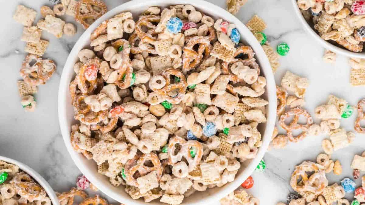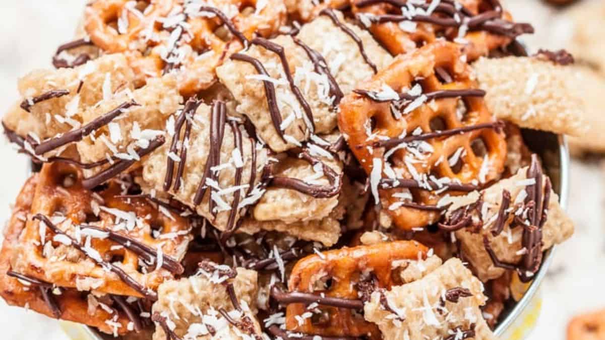 This mix falls neatly into the category of sweet and salty snacks because it uses pretzels, cereal, and a smooth white chocolate coating. It comes together quickly and cools into firm clusters. Each bite has a balance of crunch and sweetness. It is perfect for gifting or casual snacking.
