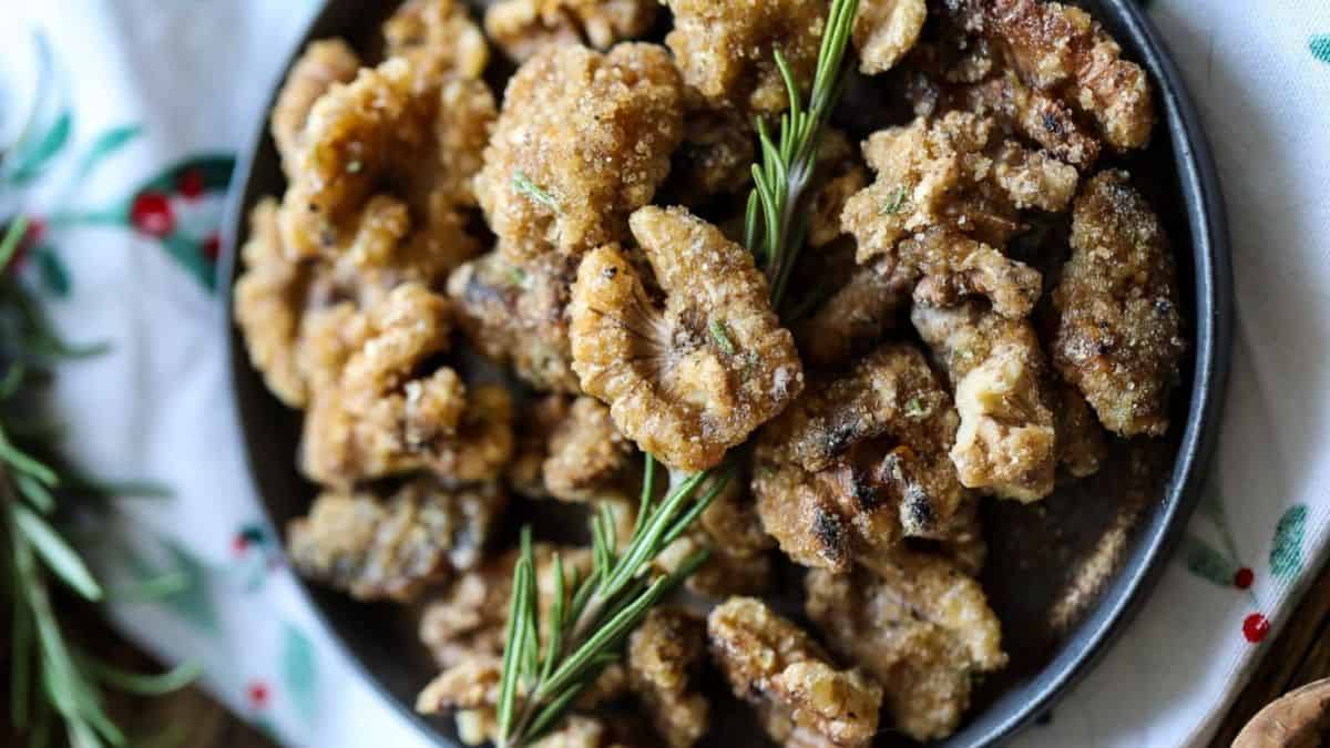 These walnuts carry a sweet caramel coating with a hint of rosemary for extra depth. They roast quickly and cool into crisp clusters. They work well as a snack or as a topping for salads. They also package nicely for small gifts.