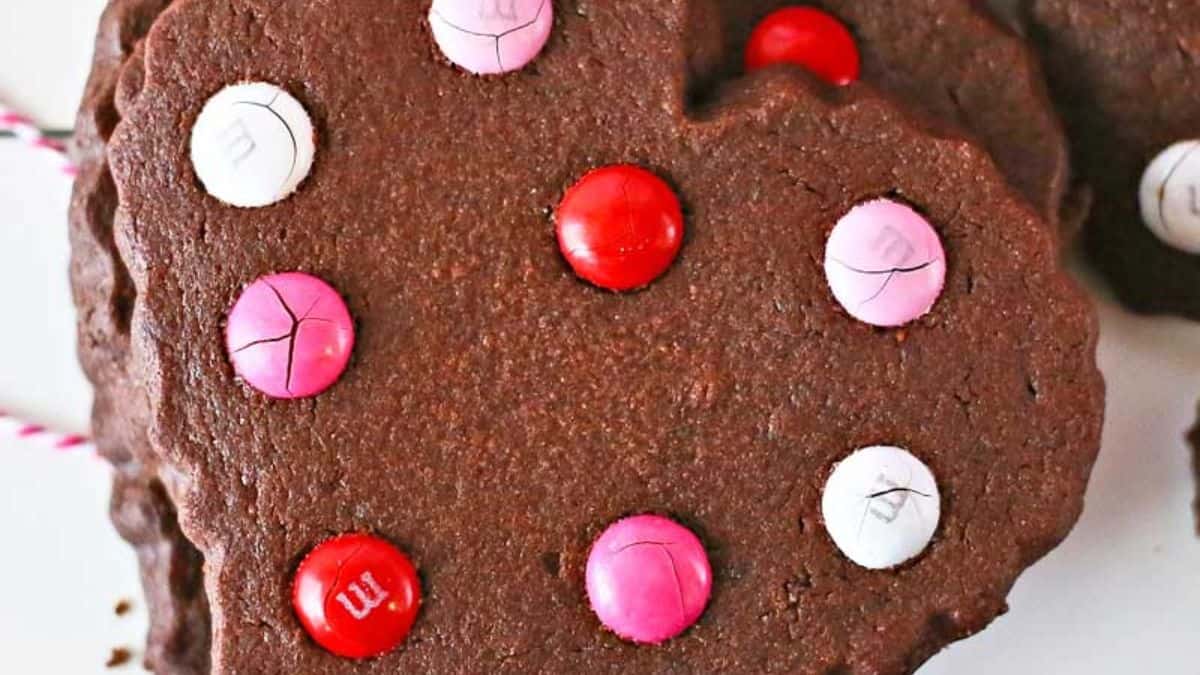 These chewy cookies get a festive upgrade with colorful M&M candies. Their crispy edges and soft center make them a great pick for any Valentine’s Day celebration. Whether baking for kids or adults, they add a fun touch to Valentine cookie recipes. Bright, sweet, and easy to make, these cookies bring color and flavor to the holiday.